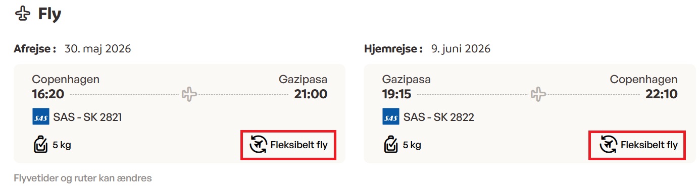 Forskellen mellem fleksible og ikke-fleksible flyrejser ligger i, hvordan de er booket. Derfor gælder der forskellige betingelser. I bookingtrinnene kan du se, om flyrejsen er fleksibel eller ikke-fleksibel.
