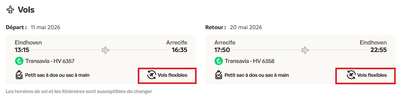 La différence entre les vols flexibles et non flexibles réside dans la manière dont ils sont achetés. Cela entraîne des conditions différentes. Lors des étapes de réservation, vous pouvez voir si le vol est flexible ou non flexible.